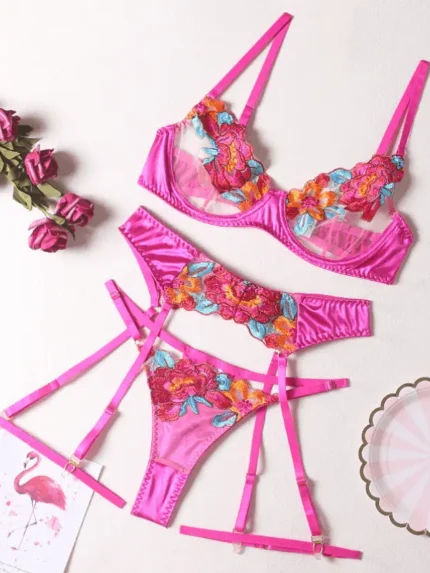 3Pcs Floral Embroidered Sexy Sheer Push-Up Bra & Panty Set With Garter