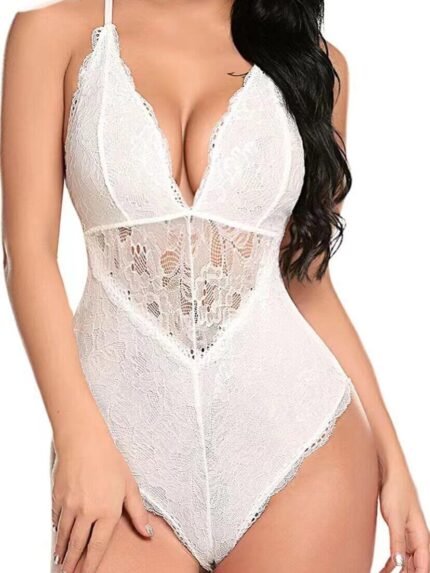 Sexy Lace Open Crotch Teddy Lingerie with Deep V Neck & Open Back