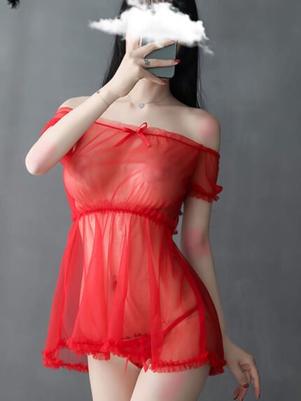 Sexy Sheer Lace Off-Shoulder Babydoll Set – 2 Piece Mesh Lingerie