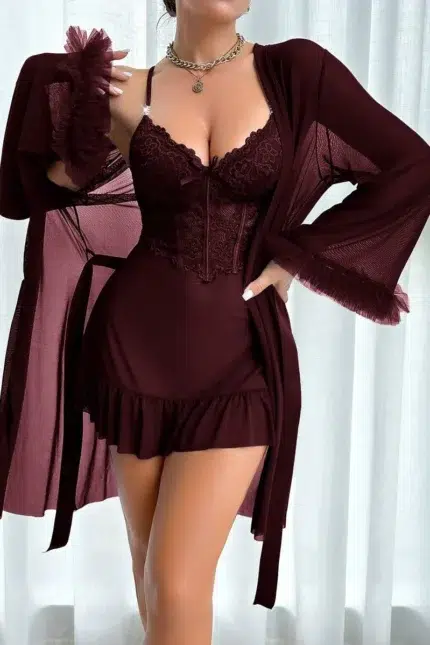 2PCS Lace Camisole Nightgown Set with 3D Floral Mesh Robe Sexy Fishbone Line Waist Lingerie Sleepwear