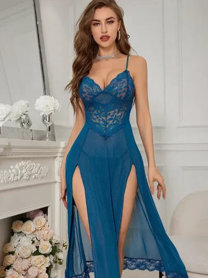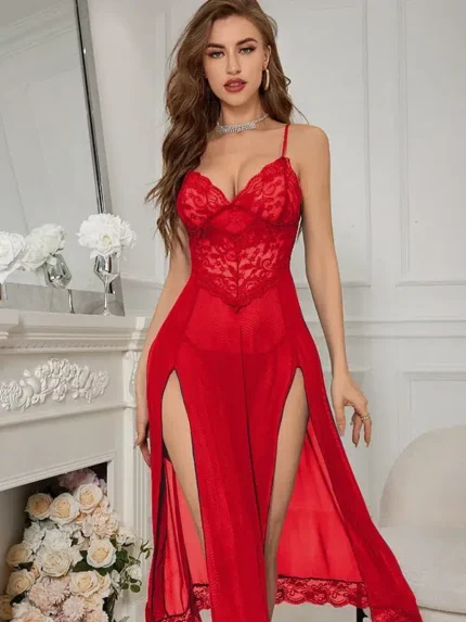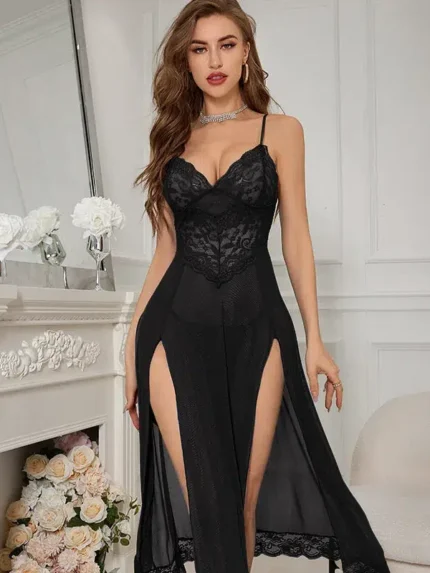 Sheer Lace Split Babydoll Lingerie Set with Thong – Sexy Mesh Nightdress