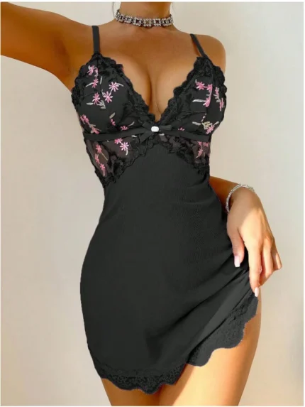Sheer Mesh Embroidered Mini Dress Babydoll Lingerie – Strappy Lace Nightwear with Ruffle Hem