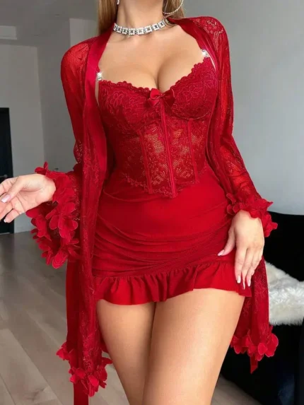Sexy Sheer Lace Off-Shoulder Babydoll Set – 2 Piece Mesh Lingerie