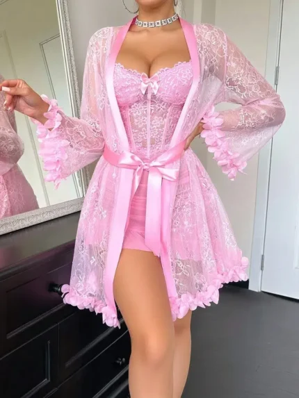 3D Floral Lace Robe & Boned Waist Camisole Nightgown Set