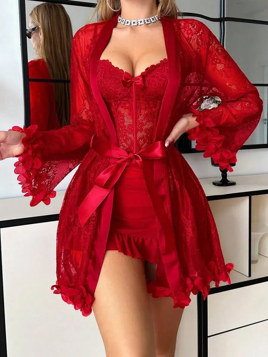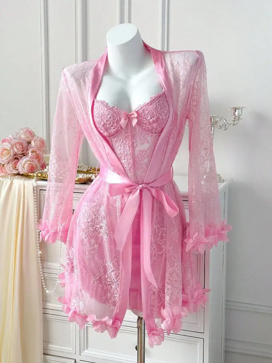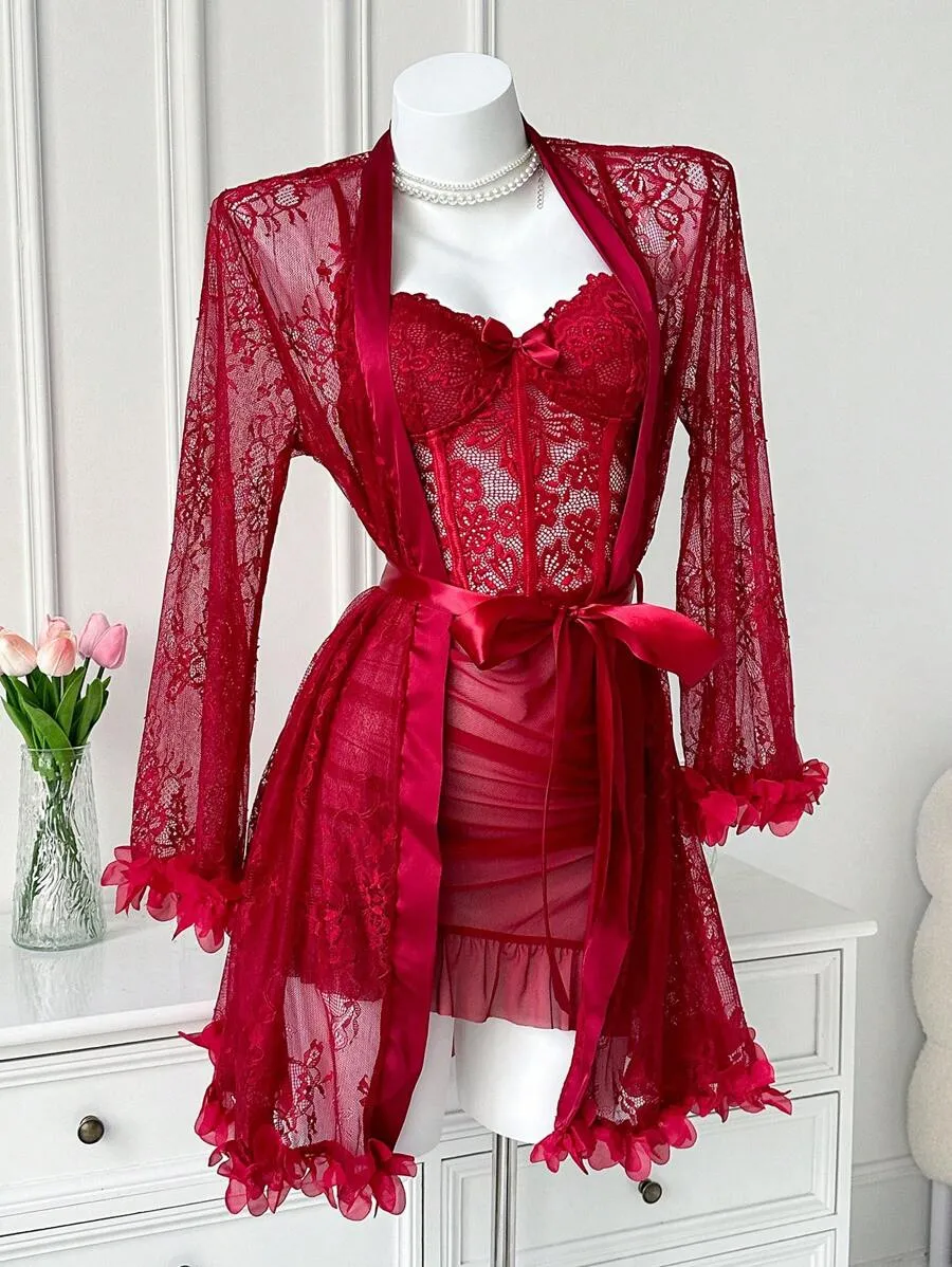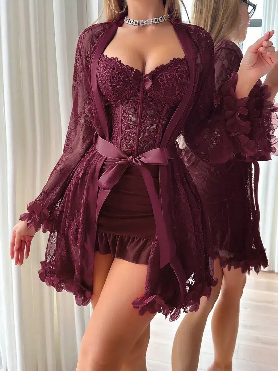 Sexy Lace Patchwork Corset Lingerie Set With Ribbon Tie Design