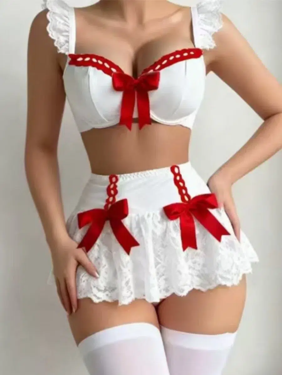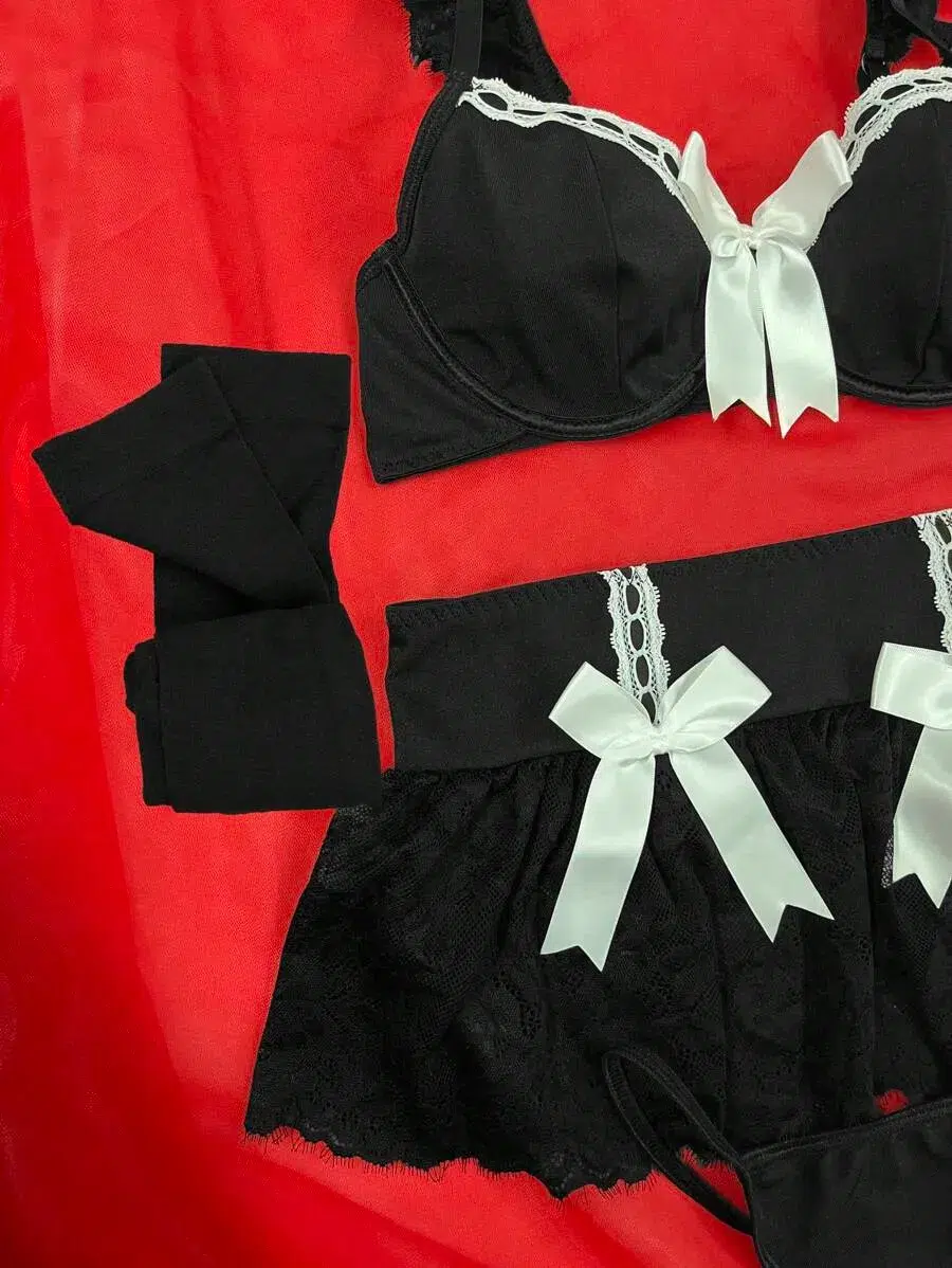 Add a touch of confidence and charm with this 4-piece lace lingerie set. Designed with romantic lace, ruffled trims, and satin bows, this matching ensemble includes a supportive bra, high-waisted skirt,matching thong, and coordinating thigh-high stockings. Soft, stretchy, and beautifully detailed, it highlights your natural curves with an elegant, feminine touch. Perfect for special evenings, photoshoots, or gifting moments that feel truly special.
