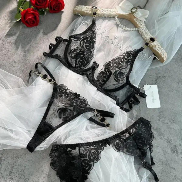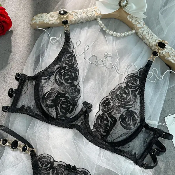 Be the first to review “Black Floral Lace 3-Piece Lingerie Set with Garter Belt – Sexy Bra, Panty & Suspender Set”
