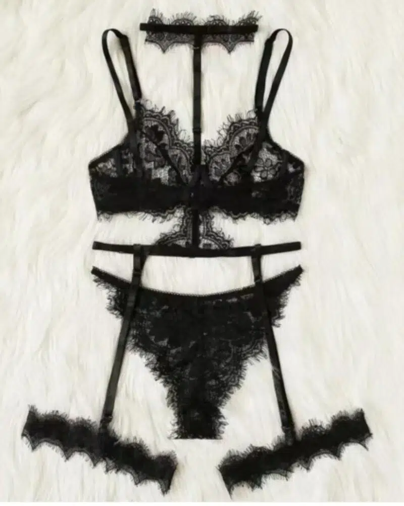 Black Floral Lace 4-Piece Lingerie Set with Harness Details