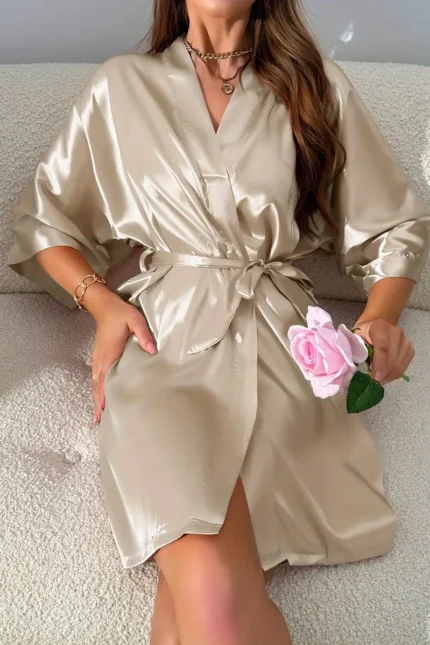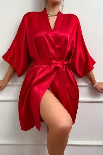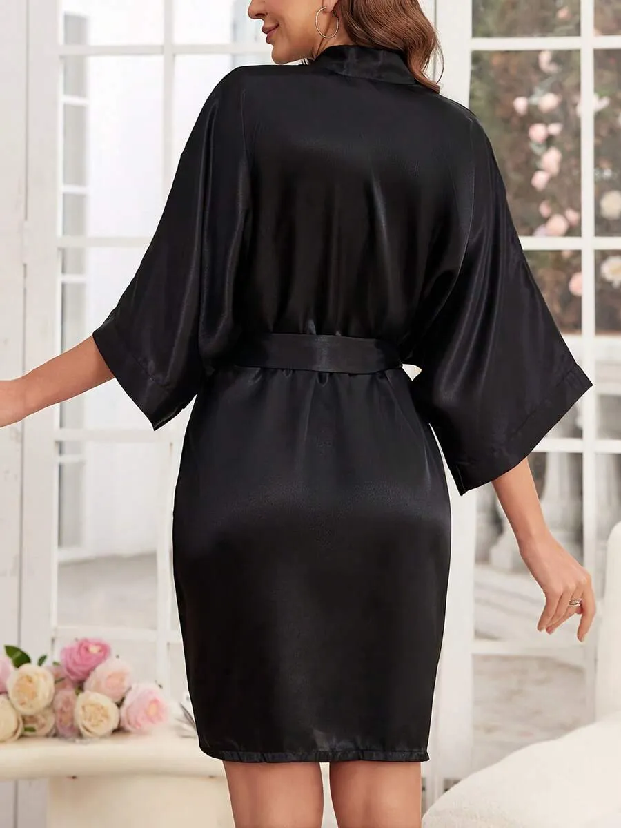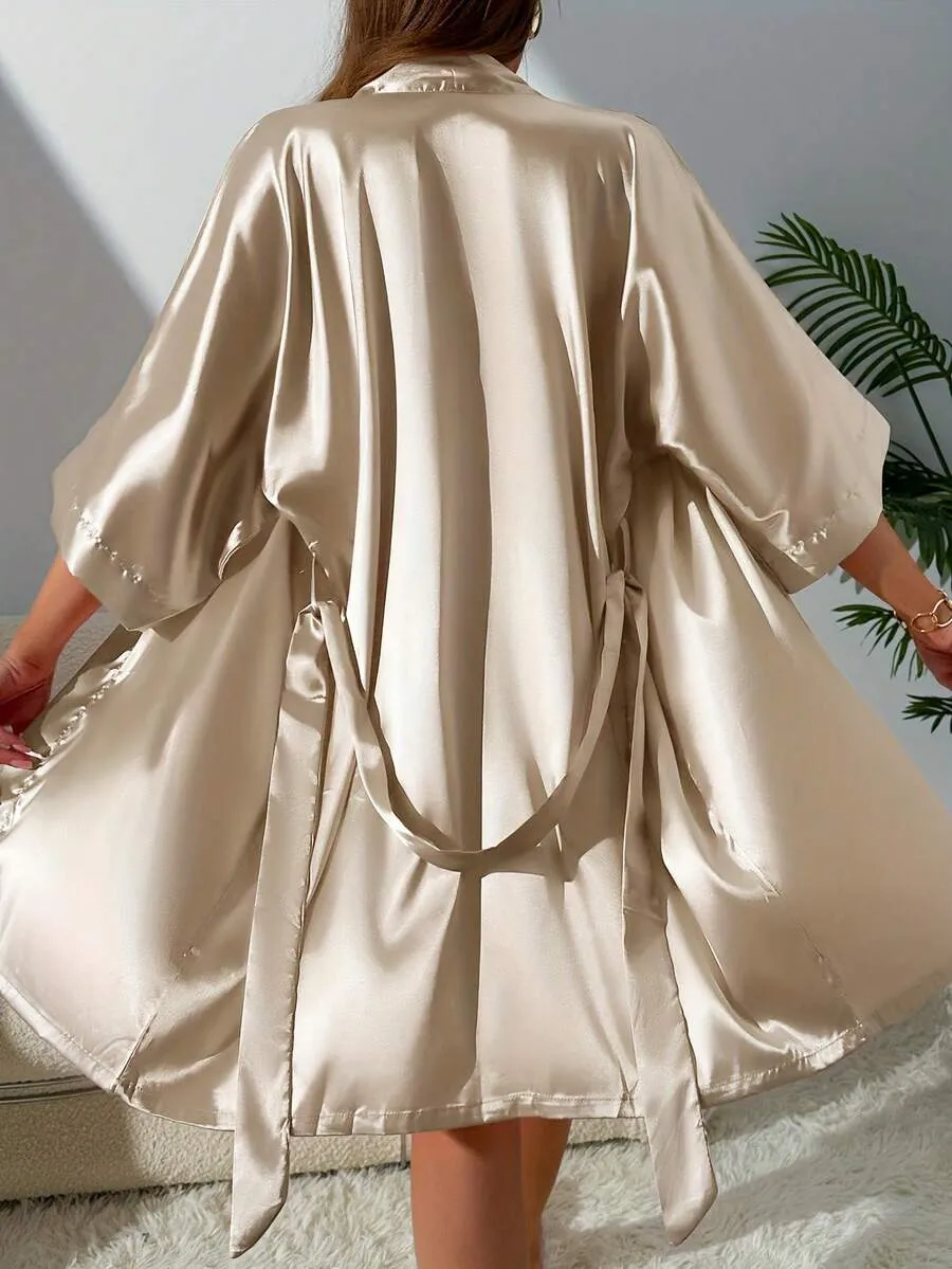 Plus Size Lace Nightgown Set – 3-Piece Cami Dress with Sheer Bell Sleeve Robe & Thong