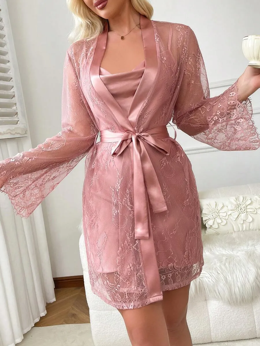 Lace Robe And Satin Slip Dress Sleepwear Set Pajama Set