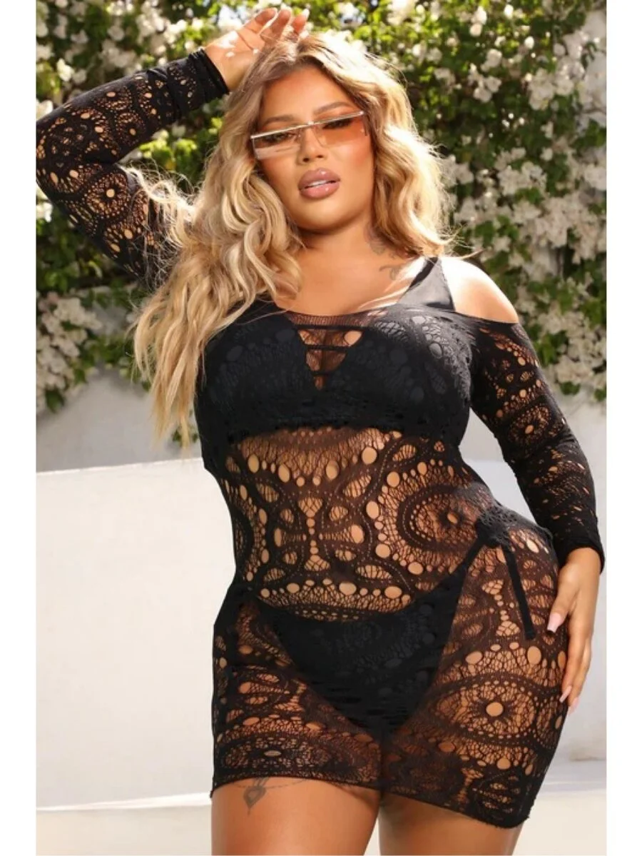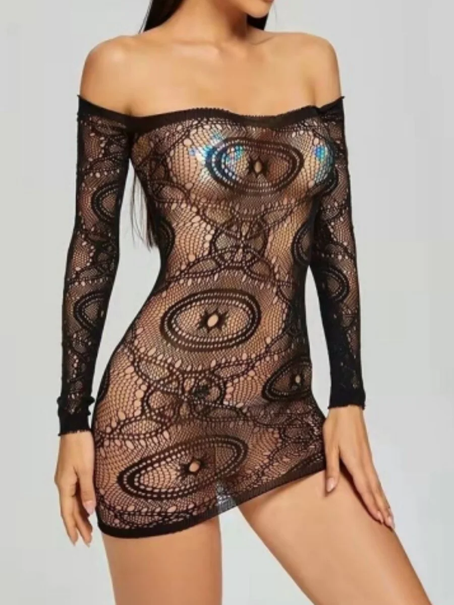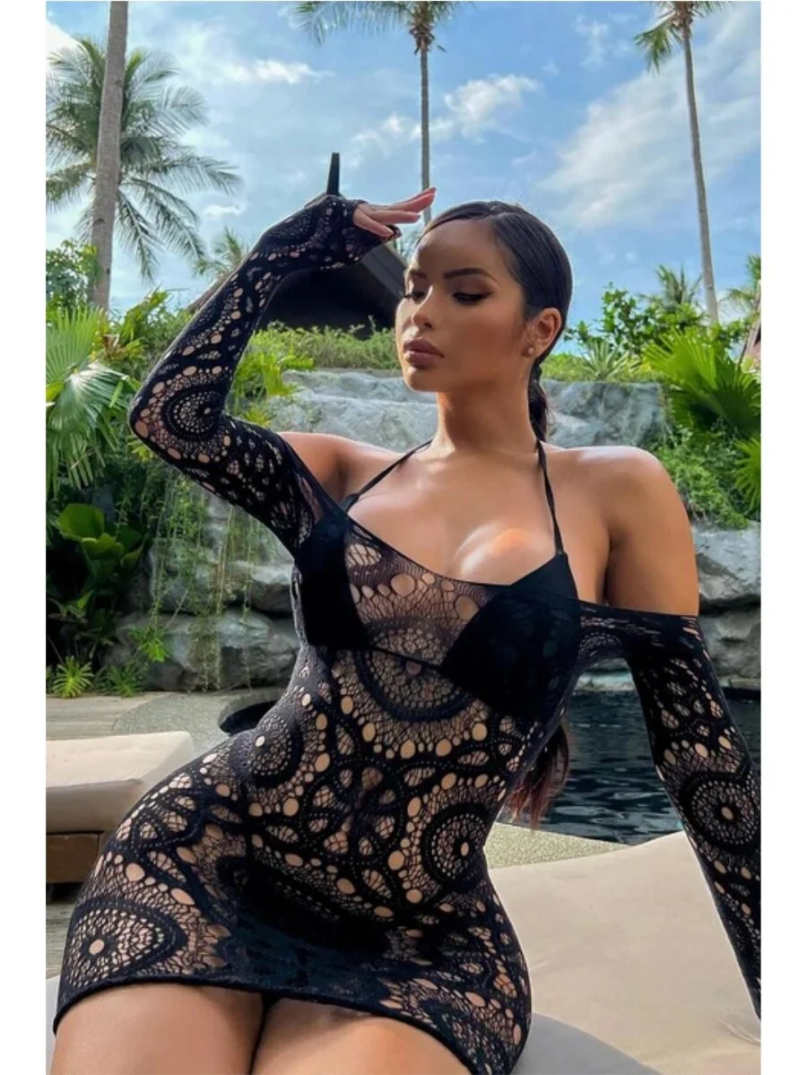 Scalloped Lace Halter Crotchless Teddy with Open Back & Mesh Ruffle Hem