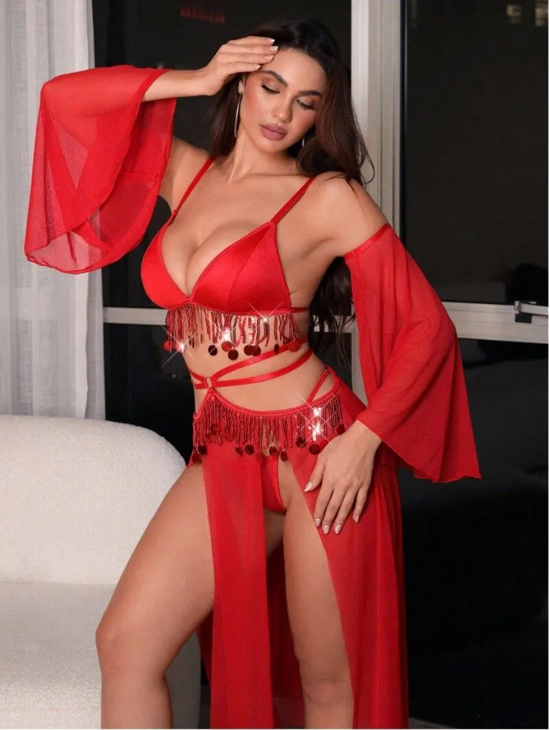 Red Sequin Fringe Mesh Bralette & High-Slit Skirt Set with Detachable Sheer Sleeves
