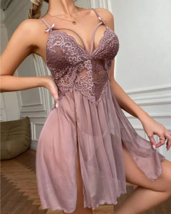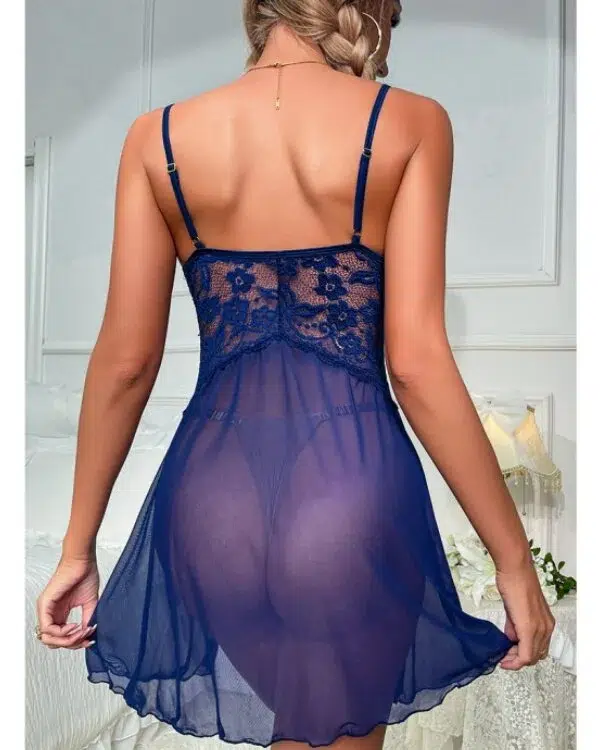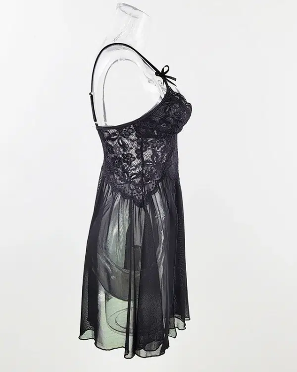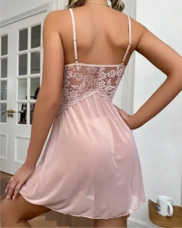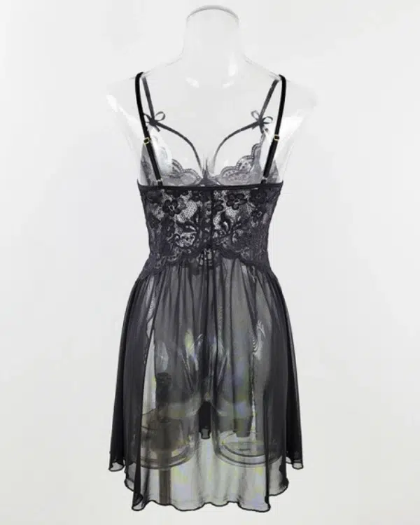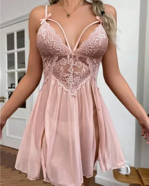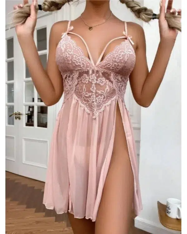 The babydoll features a deep V neckline, delicate floral lace cups, and adjustable spaghetti straps for a more personalized fit. A soft mesh body creates light, airy movement, while the high side split design adds a flirtatious touch that elongates the legs and enhances the silhouette. The matching panty completes the look with a coordinated finish.