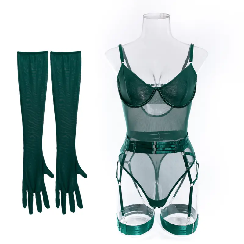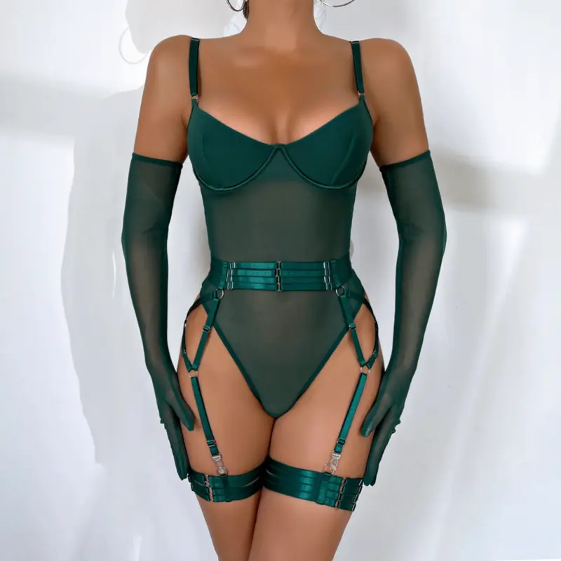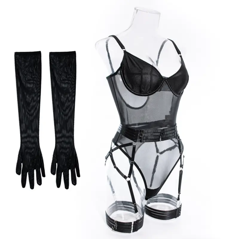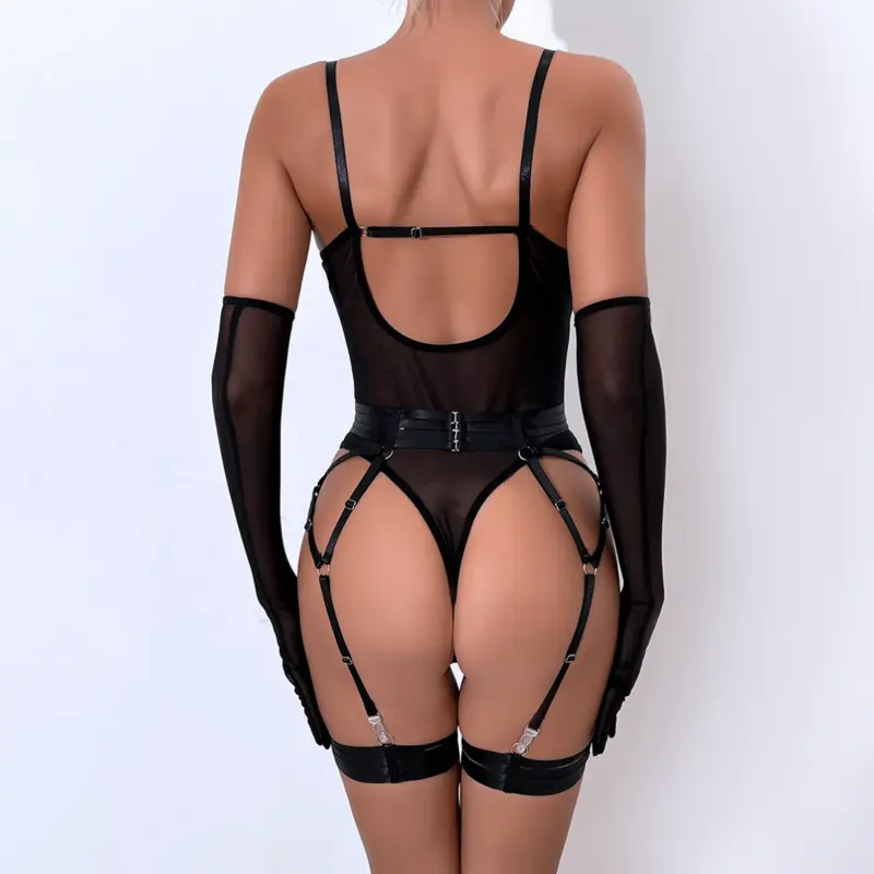 Unleash your boldest self in this Sexy Mesh Garter Bodysuit. Featuring underwire cups for a lifted silhouette, sheer mesh panels that tease just the right amount, and adjustable harness-style straps with garter attachments for a daring finish. The matching long gloves add a sultry edge, making this Sexy Mesh Garter Bodysuit ensemble perfect for intimate nights, clubwear, or role play. A striking lingerie piece designed to turn every glance into pure desire. 💋
