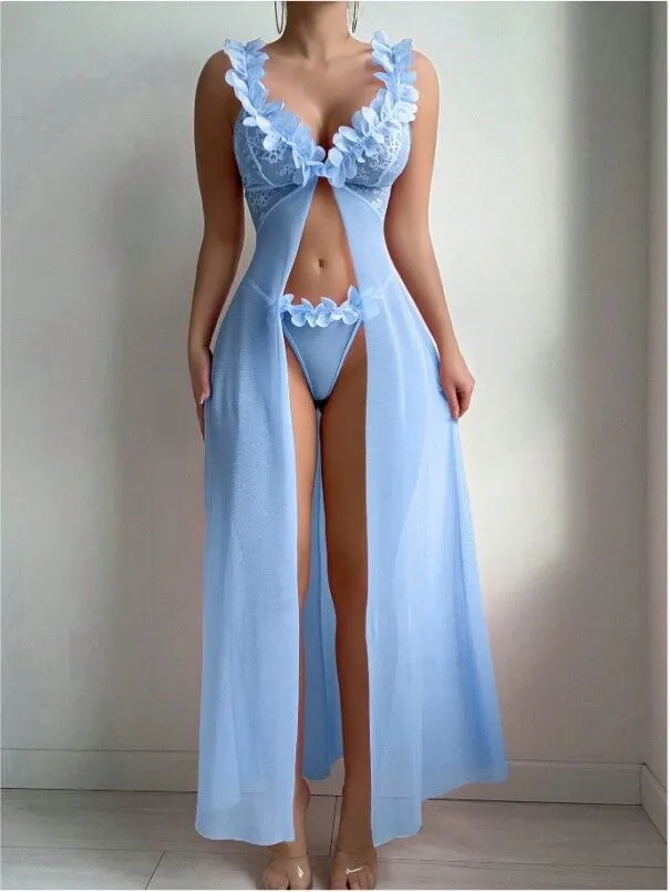 Sheer Mesh Maxi Nightdress Set with Floral Trim