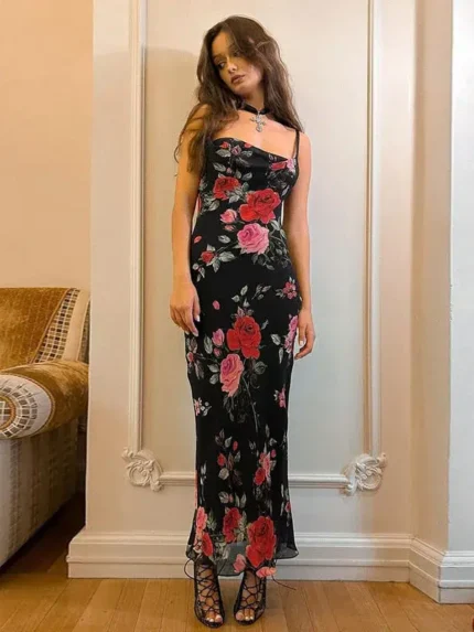 Elegant Floral Print Spaghetti Strap Maxi Dress