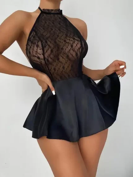 Lace-Trimmed Halter Babydoll Nightie: Backless Silhouette with Bow Accent
